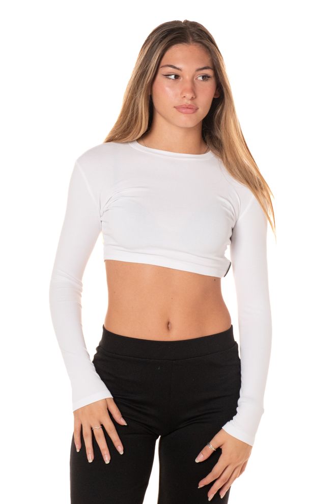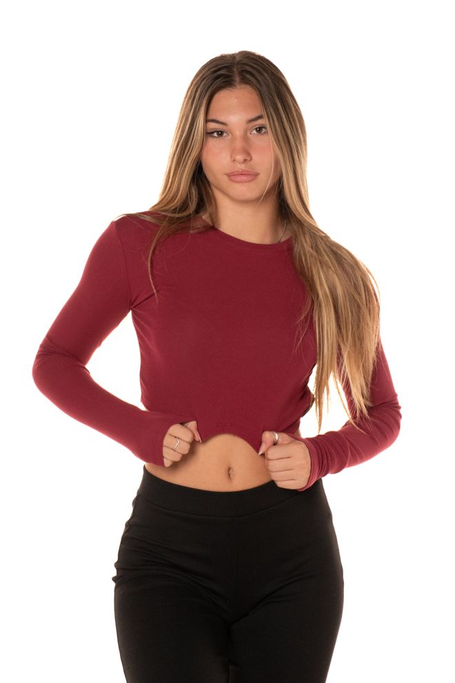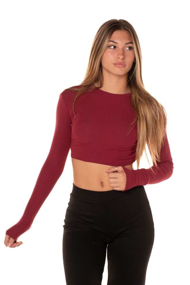 Tshirt da donna a manica lunga dal fit crop. Vestibilita' Slim. La modella è 170 cm e indossa la taglia SM.