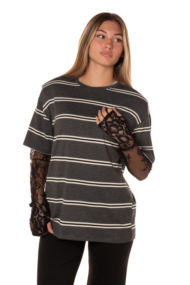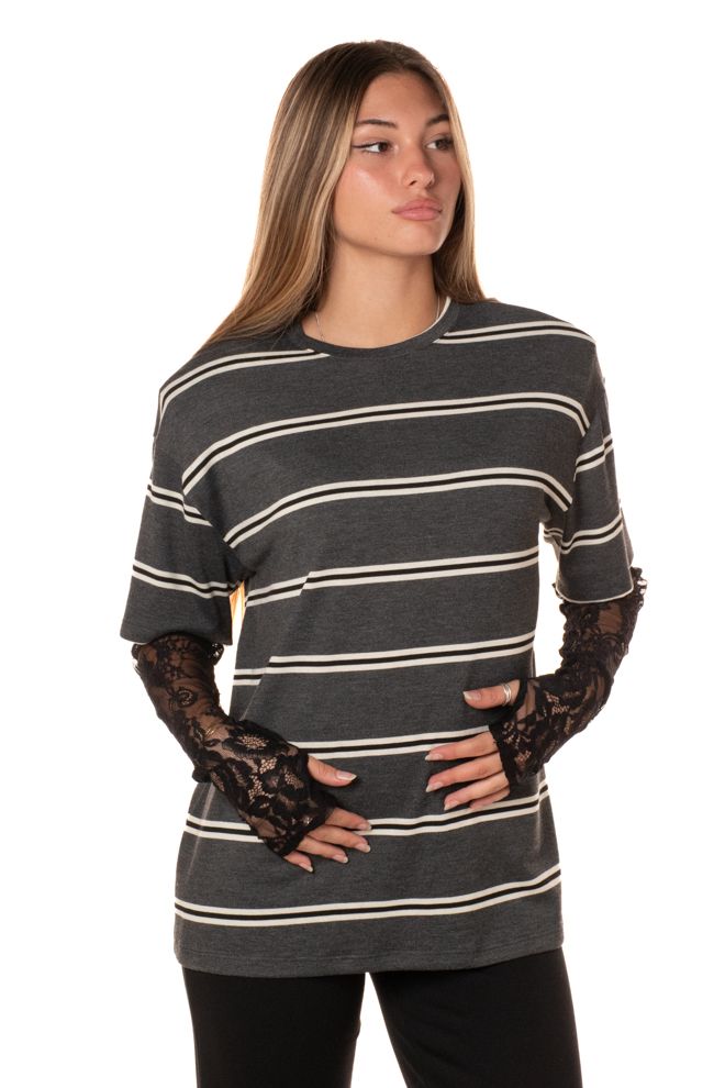 Tshirt da donna a righe con maniche lunghe in pizzo. Regular Fit. La modella è alta 170 cm e indossa la taglia S.