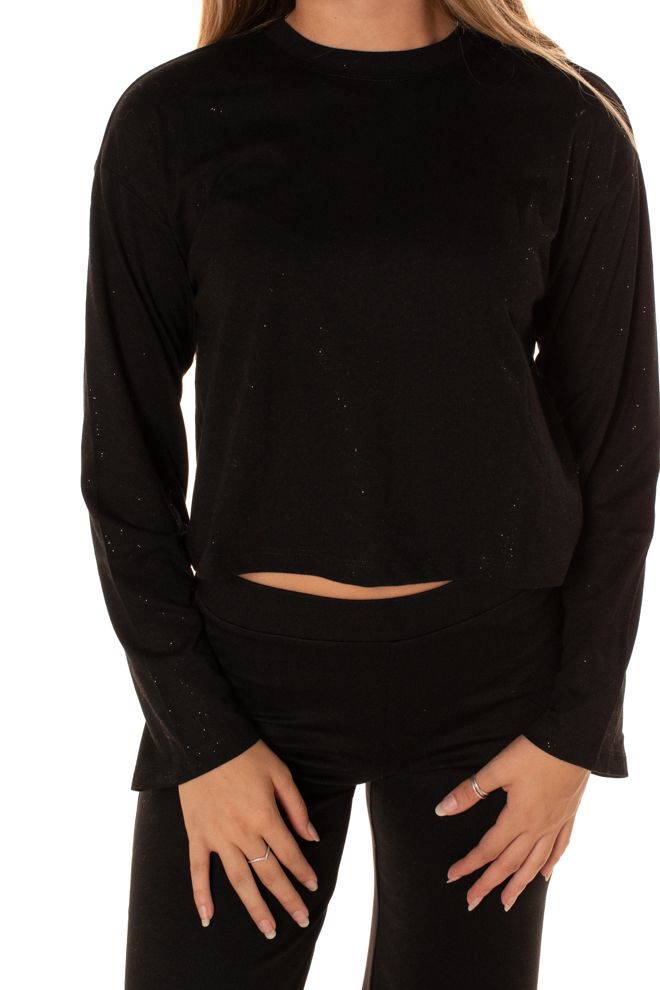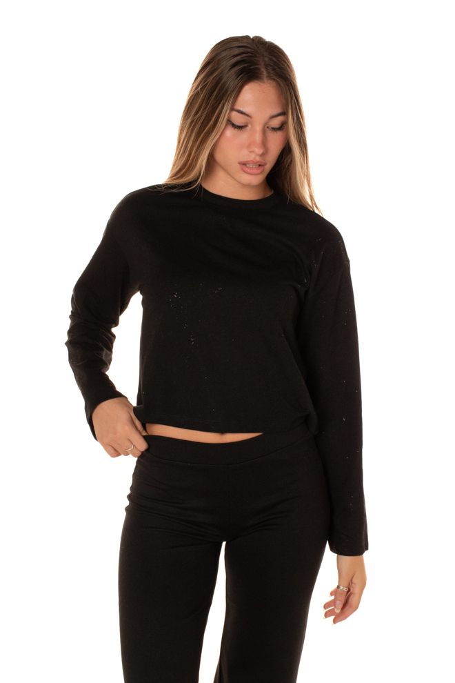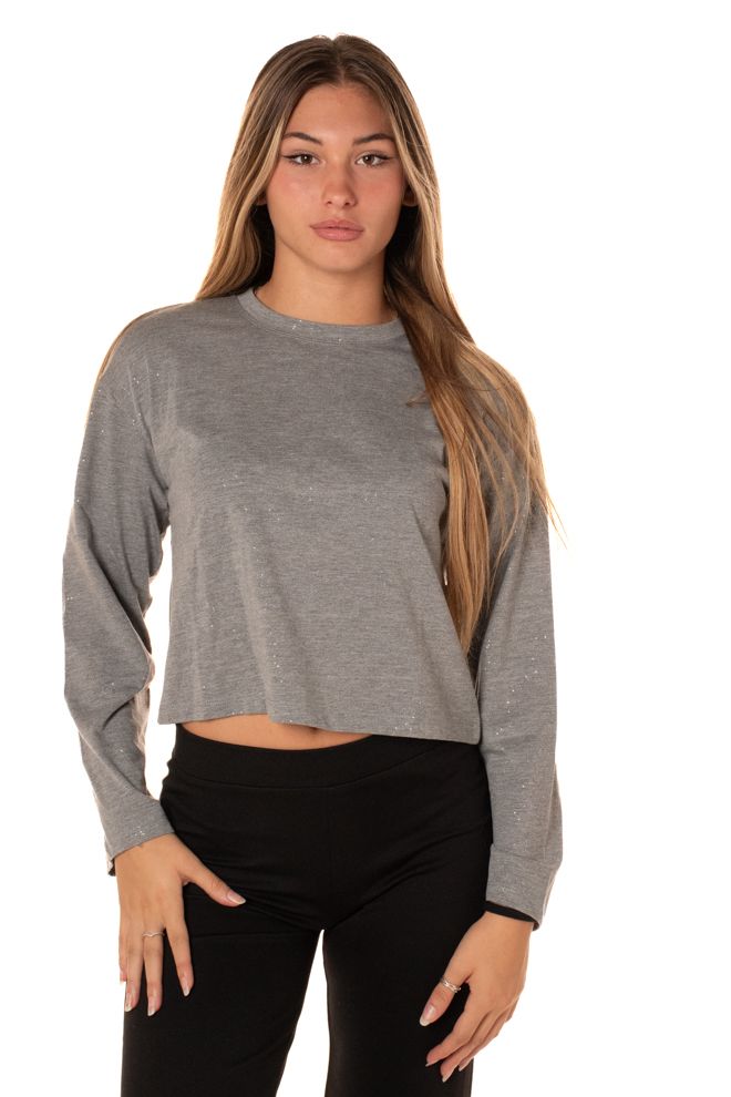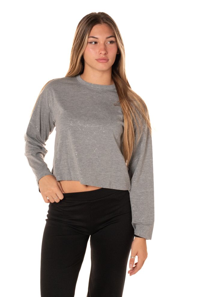 Tshirt con glitter da donna dal fit crop e relaxed. La modella è alta 170 cm e indossa la taglia S.