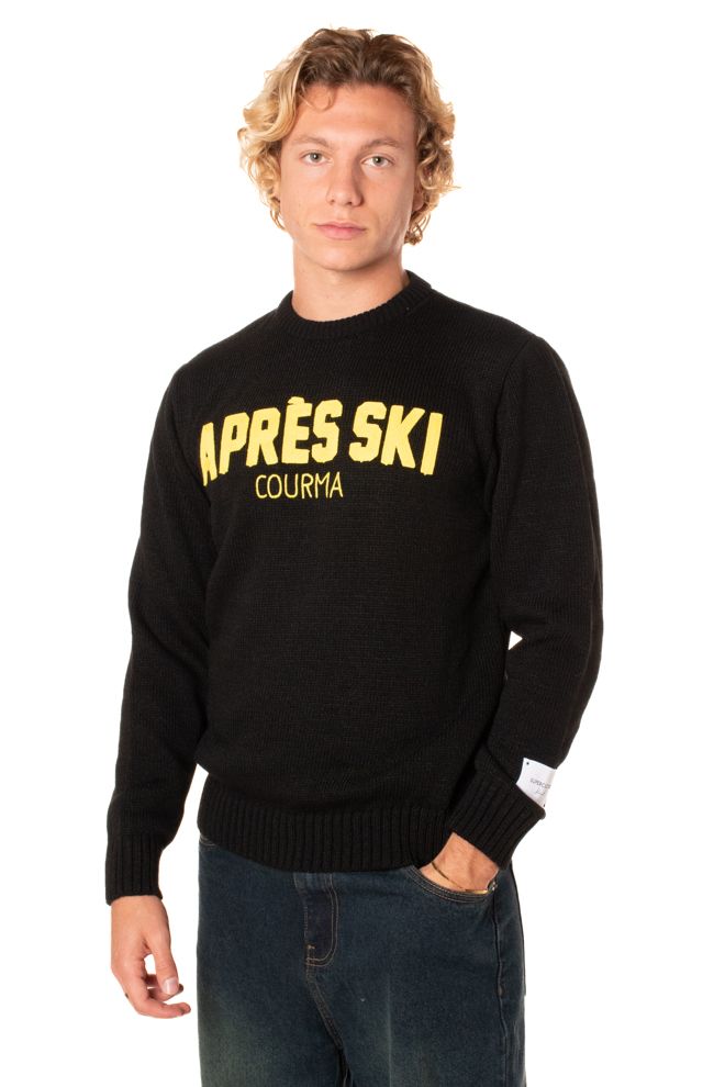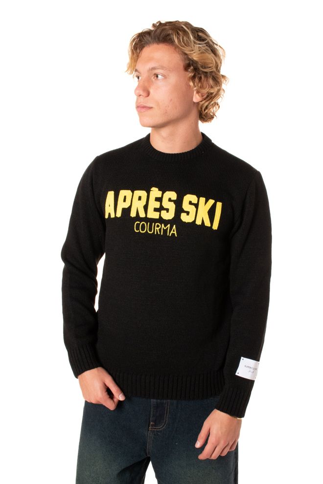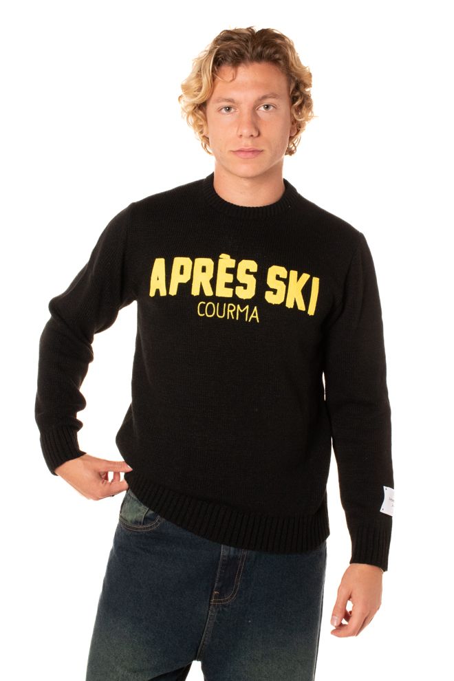 Maglione da uomo con scritta ricamata sul petto e sulla manica inferiore. Regualr Fit. Il modello è alto 185 cm e indossa la taglia L.