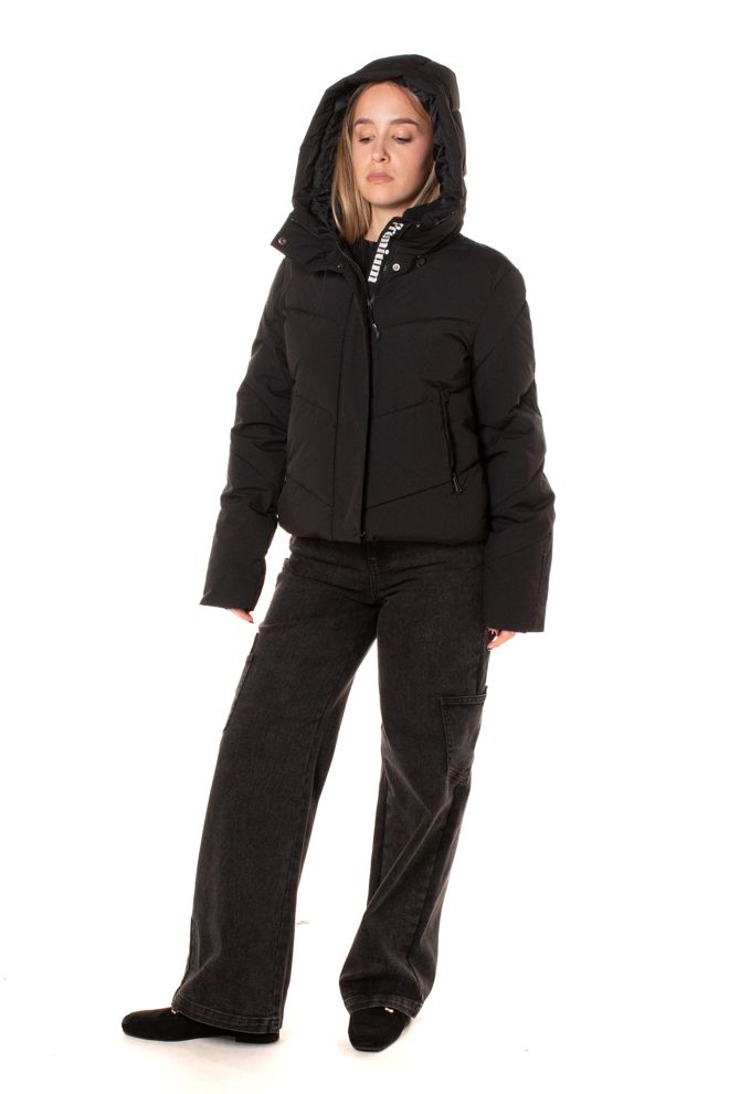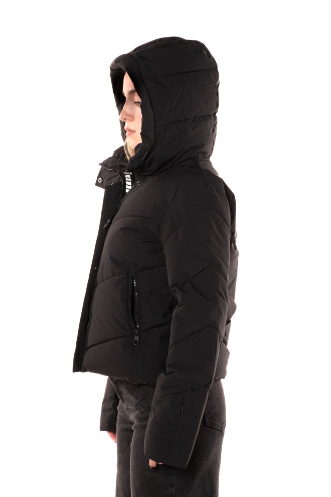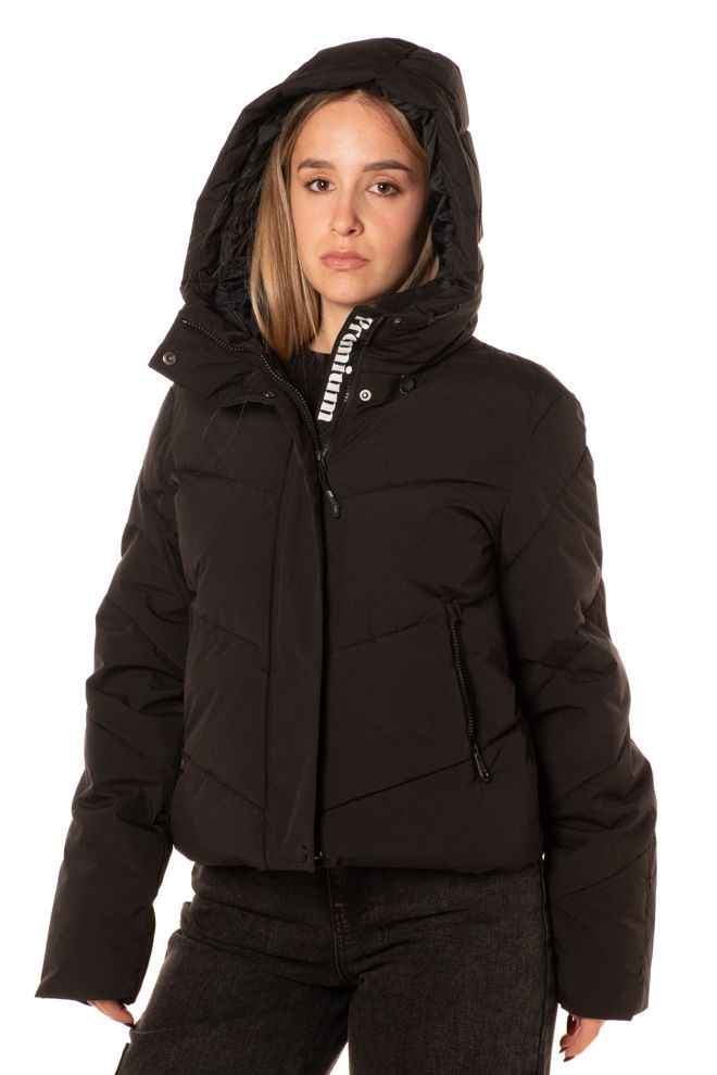 Piumino con imbottitura in poliestere riciclato, cappuccio e tasche laterali con chiusura zip . Manicotto che esce dal polso per tenere al coperto anche le mani. Vestibilità abbondante. La modella è alta 170 cm e indossa la taglia XS.