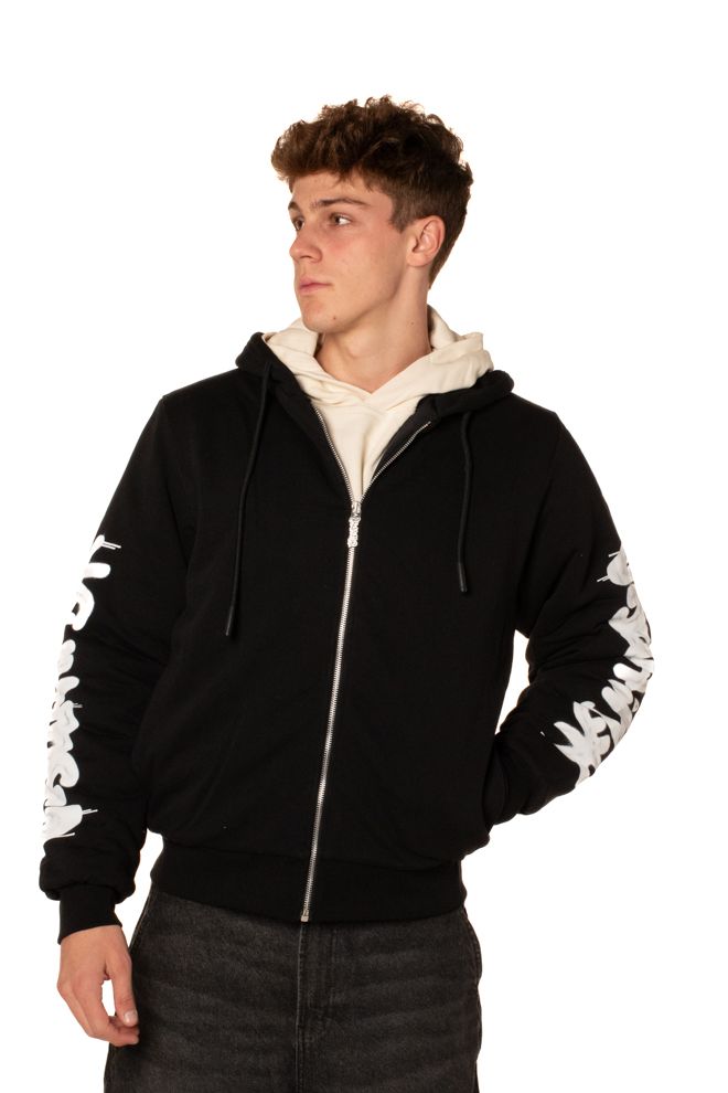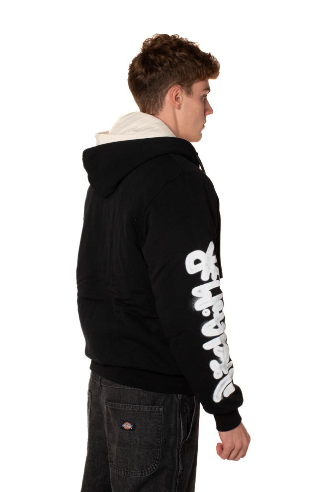 Giubbotto con cappuccio da uomo, relaxed fit. Stampe serigrafiche sulle maniche. Il modello è alto 184 cm e indossa la taglia M.