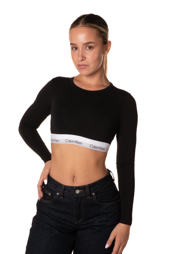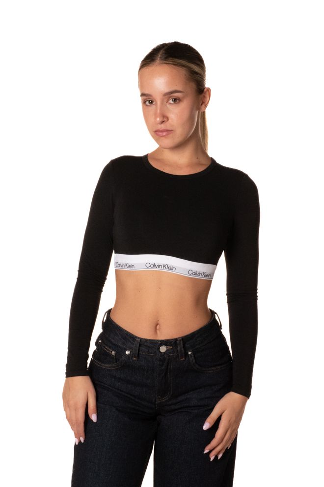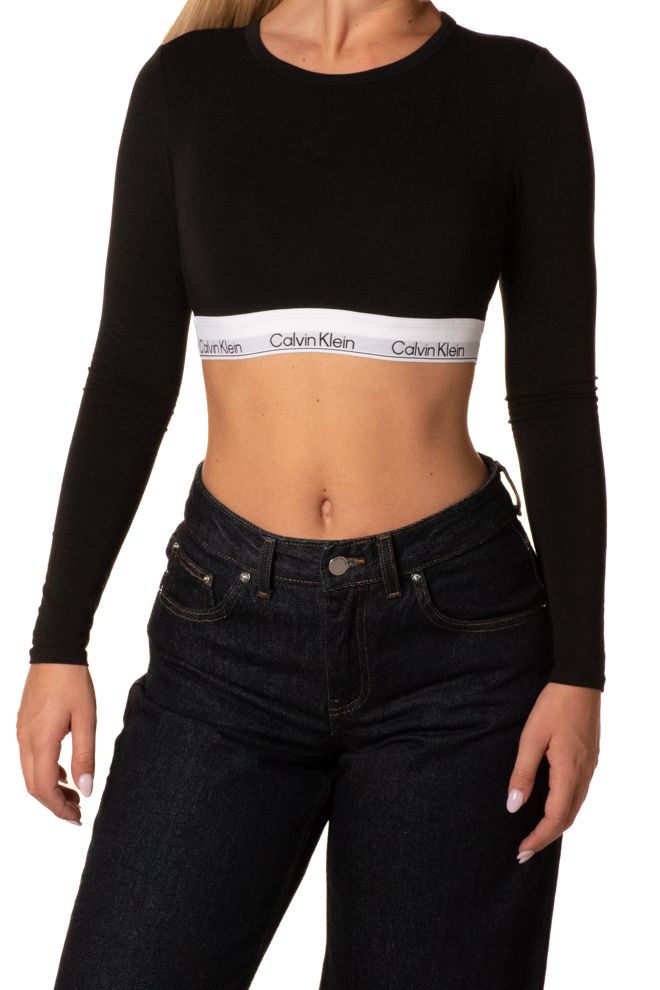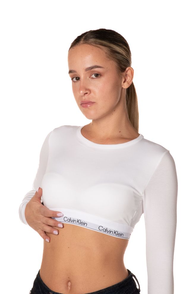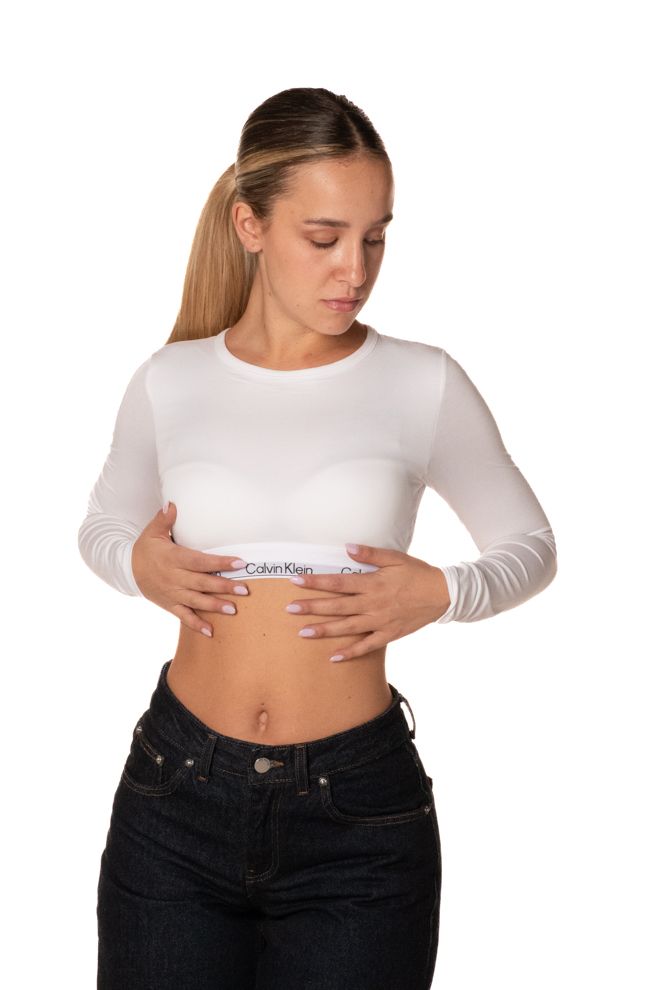 Tshirt manica lunga con bralette incorporata in cotone con elastico parlato. Slim Fit. La modella è alta 170 c m e indossa la taglia S.