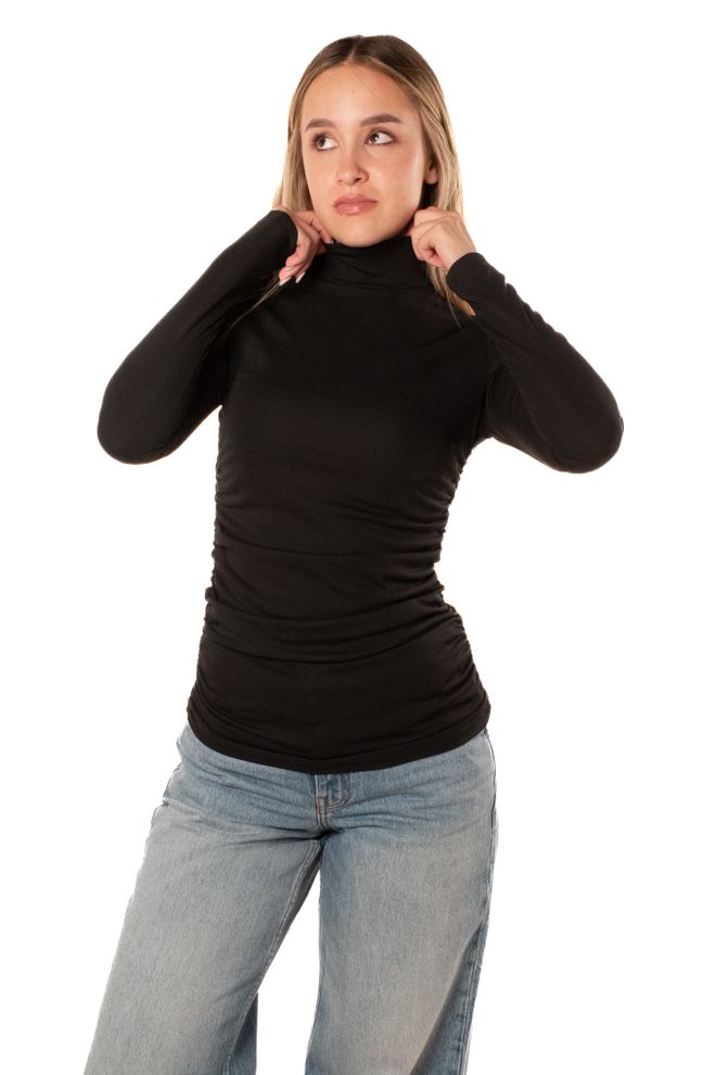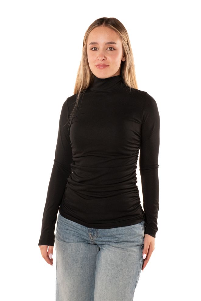 Tshirt manica lunga slim fit con collo alto da donna. La modella è alta 170 cm e indossa la taglia S.