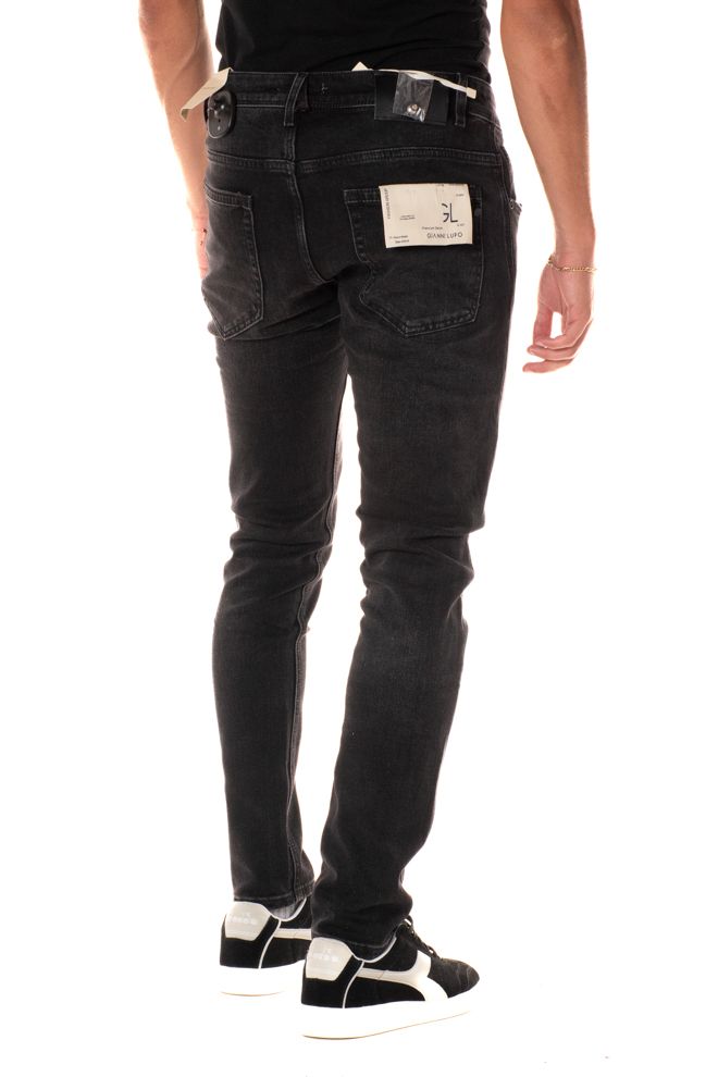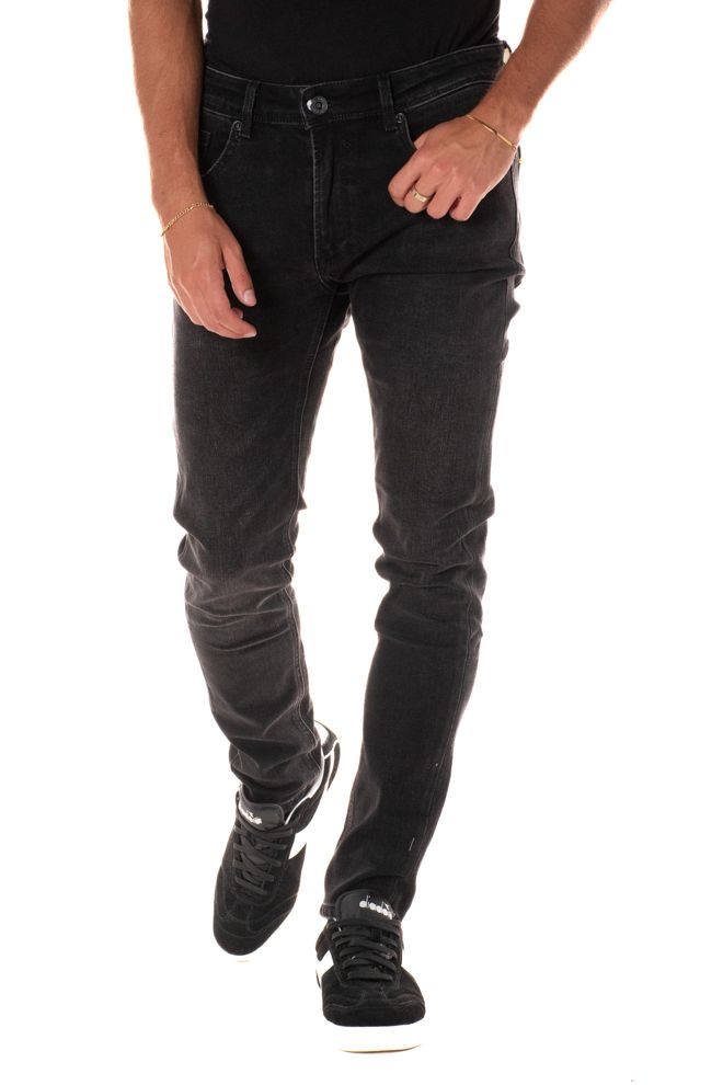Jeans skinny da uomo 5 tasche nero. Il mdoello è alto 185 cm e indossa la taglia L.