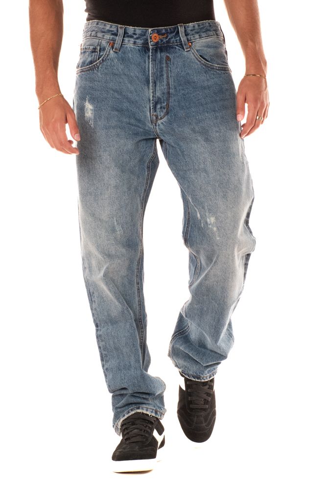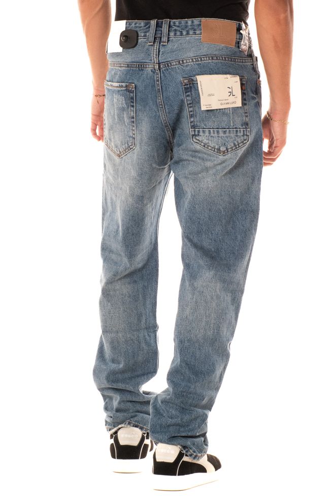 Jeans straight da uomo 5 tasche con piccole abrasioni per un look piu' street. Il mdoello è alto 185 cm e indossa la taglia L.