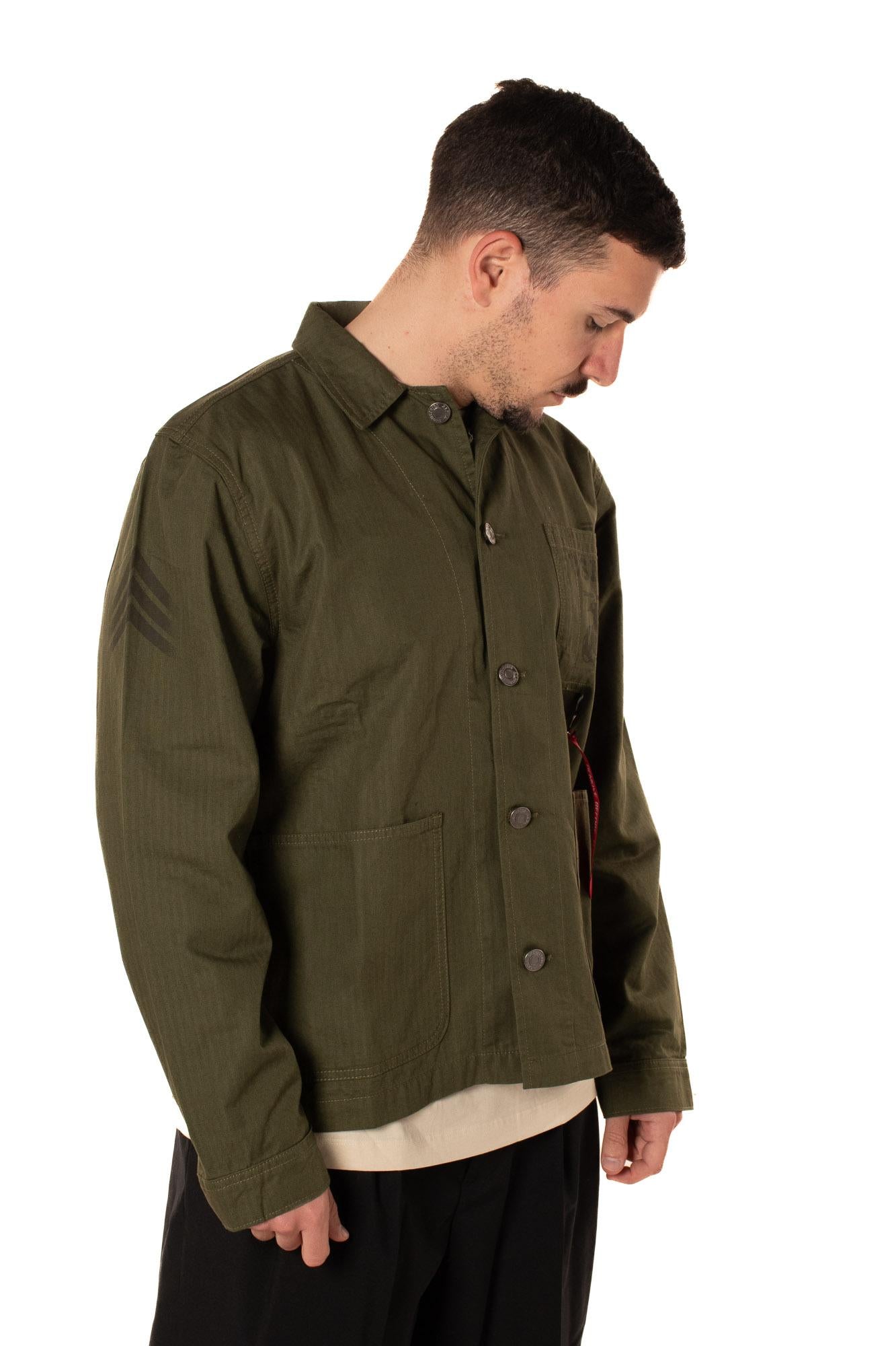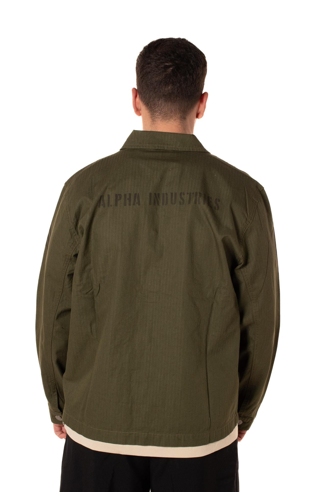 Camicia da uomo con cotone spigato e iconico laccetto Alpha Industries. Il modello è alto 183 cm e indosa la taglia L.