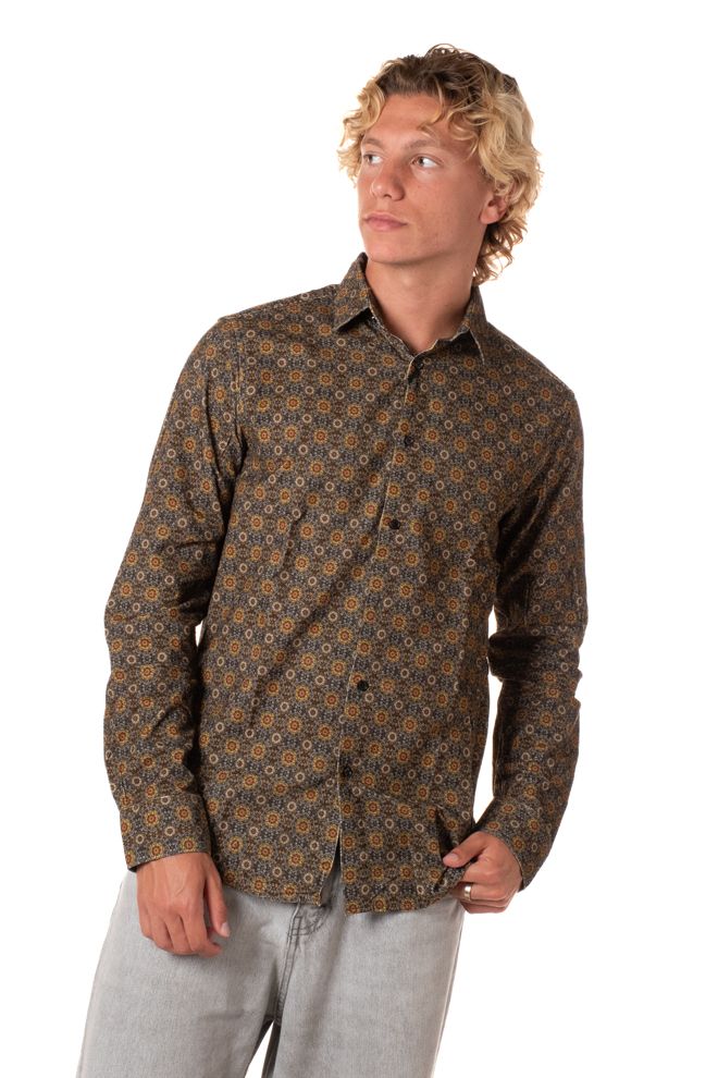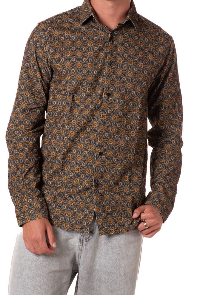 Camicia multicolor a fantasia da uomo, chiusura con bottoni nascosti. Regular Fit. Il mdoello è alto 185 cm e indossa la taglia L.