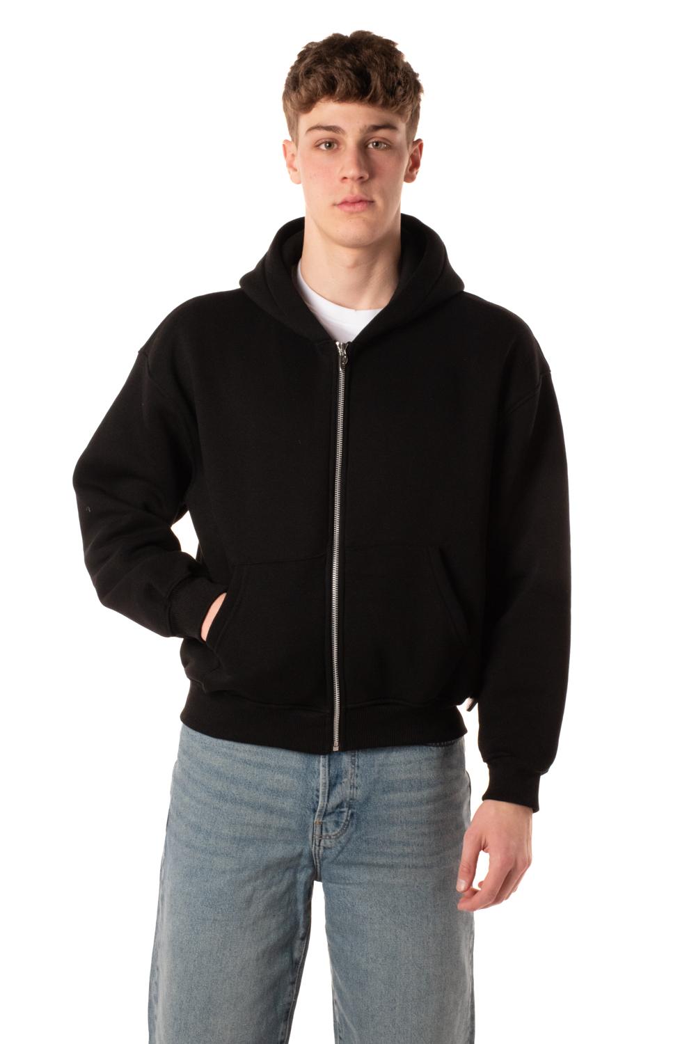 Felpa zip unisex con cappuccio, boxy fit. Interno felpato. Made in Italy. Il modello è alto 185 cm e indossa la taglia L.