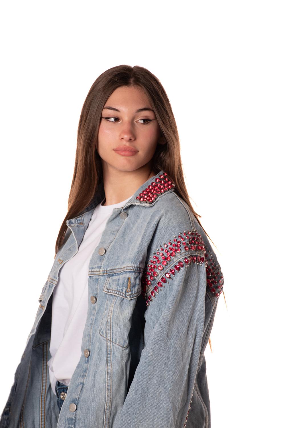 Giacca in jeans oversize con applicazione di strass sulle spalle e al colletto. La modella è alta 173 cm e indossa la taglia S/M