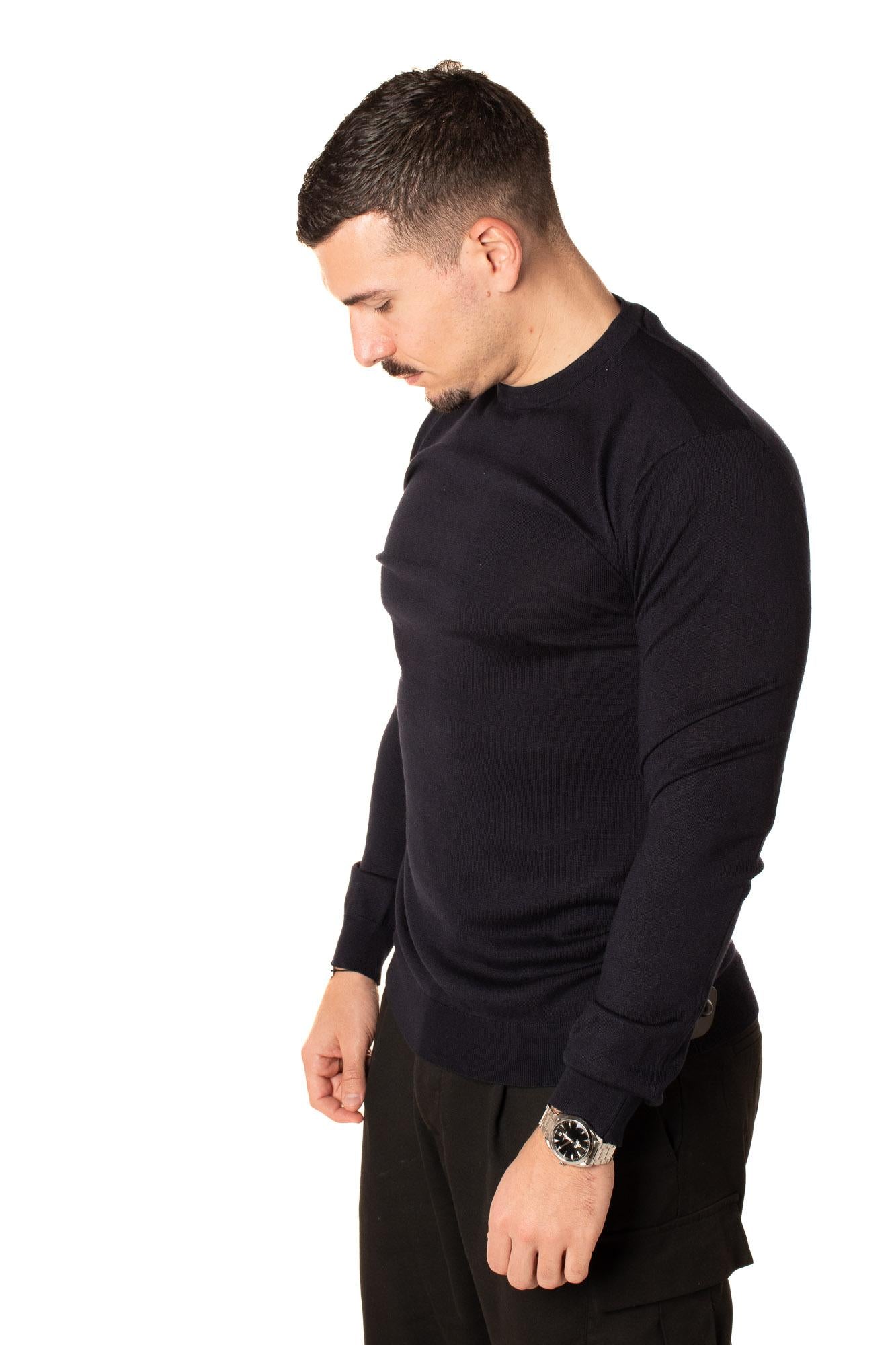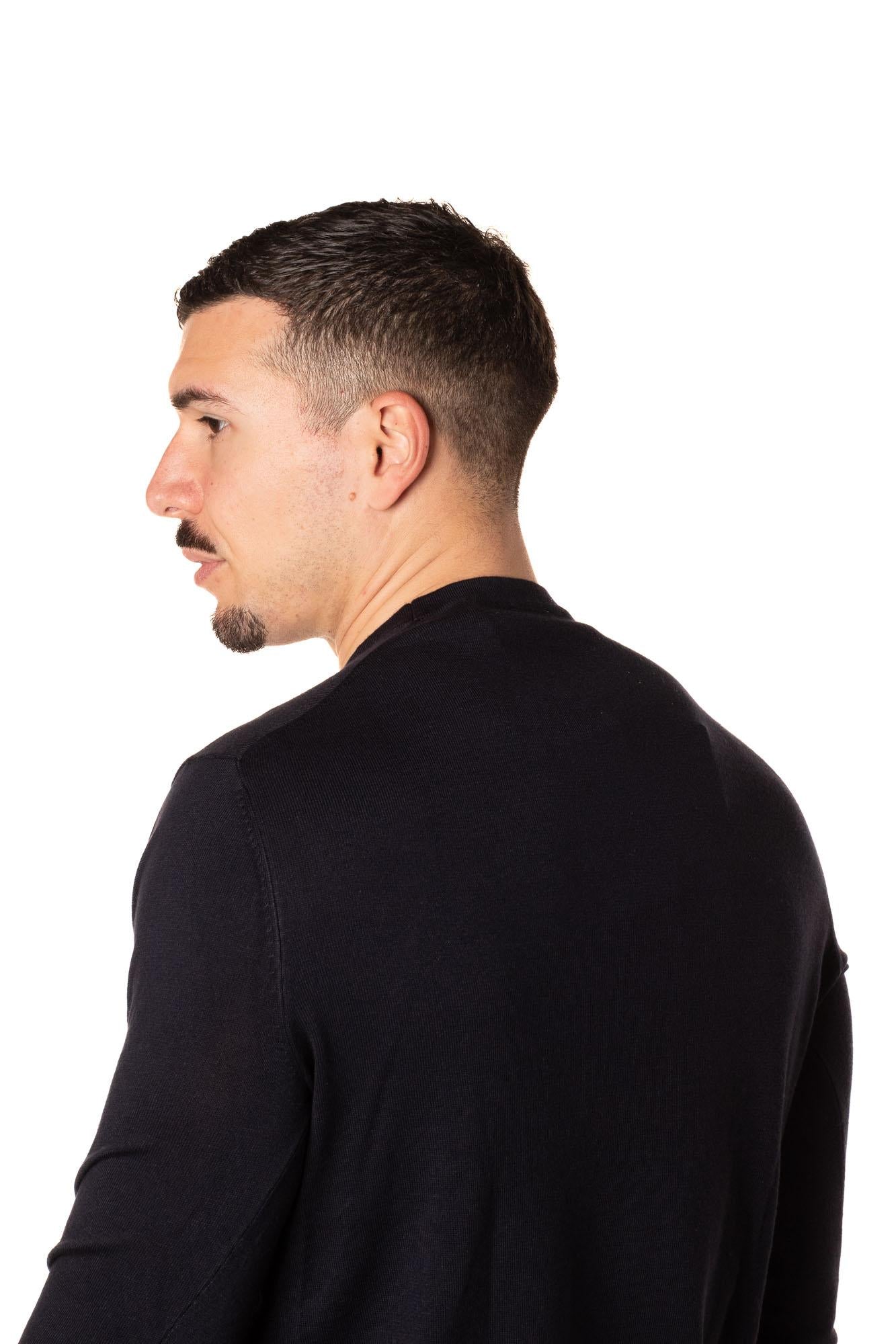 Maglioncino da uomo, regular fit. Pesantezza primaverile. Il modello è alto 183 cm e indossa una taglia L.