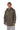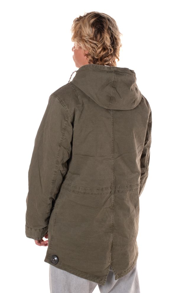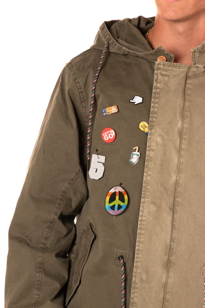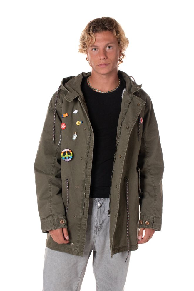 Parka verde oliva da uomo con pile all'interno disegnato, spille applicate e 2 tasche. Il modello è alto 185 cm e indossa la taglia L.