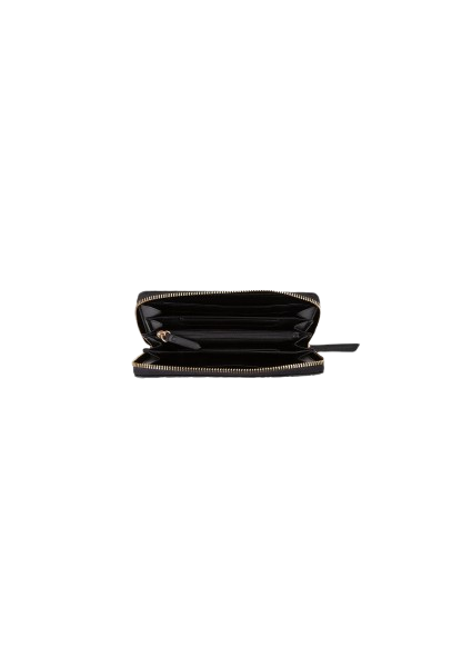 Portafoglio in ecopelle con chiusura a cerniera e logo in rilievo. Scomparti multipli al suo interno.