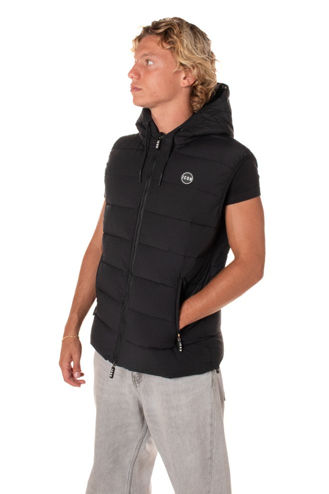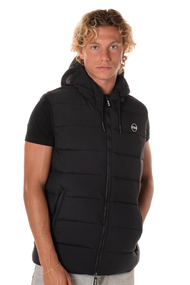 Piumino smanicato da uomo con cappuccio e chiusura zip. 2 tasche. Regular Fit. Il modello è alto 185 cm e indossa la taglia L.